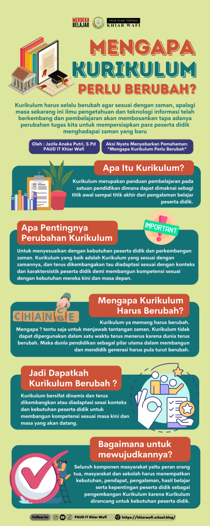 Kurikulum harus selalu berubah agar sesuai dengan perkembangan zaman, Selain itu kurikulum juga harus mempertimbangkan kebutuhan belajar murid. Sebagai contoh, zaman saya sekolah komputer baru dipelajari pada masa SMA, itupun hanya sebatas menyalakan, memetikan dan mengetik saja. Coba lihat anak sekarang, mereka sudah lahir dengan teknologi di tangannya. Bayi saja sudah pandai memainkan layar gawai. Itulah mengapa kurikulum juga harus berubah, agar kita dapat menyiapkan generasi yang akan datang yang visioner dan mampu memandang ke depan.