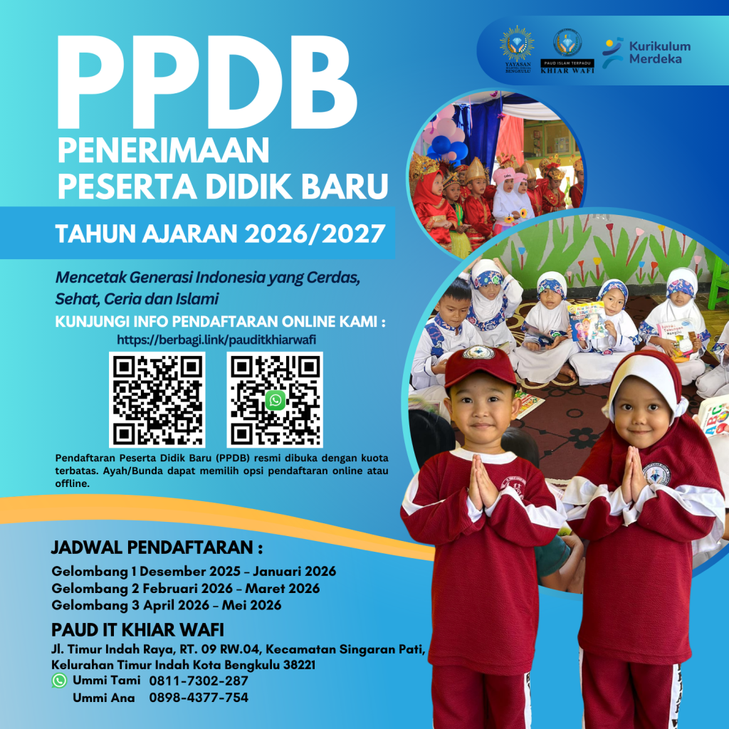 Informasi ini akan membantu Ayah Bunda untuk melakukan pendaftaran putra / putri tercinta sebagai calon peserta didik PAUD IT Khiar Wafi untuk Tahun Ajaran 2026/2027.